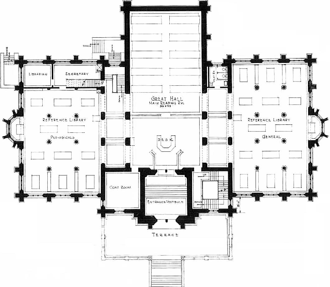 Perrot provided a central block crowned with a tower, flanked by two pavilions. In front, a wide flight of steps ascends to a raised platform and, through a pointed arch, the reader is led via the entry portal up a further set of internal stairs to the principal floor of the library.