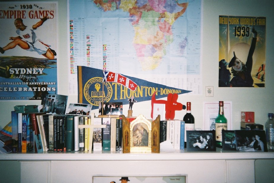 And the mantle from my room the past year. For a closer up look at the random items including architectural books, John le Carré novels, the program from the Knights of Malta ball, a bottle of cheap red, the Penguin editions of Gerald of Wales, and Alfred the Great, and R.G. Cant’s history of St. Salvator’s College, click here.