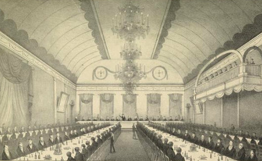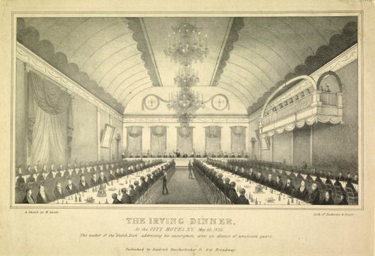 Irving was arguably the first American celebrity, and deservedly so. After a seventeen-year exile in England, France, Germany, and Spain, the author returned to New York in 1832, and a celebratory dinner was held in his honor at the City Hotel in New York on the evening of May 30. He is seen in this contemporary picture addressing those who assembled to render him honor, many of them from among the city’s political, cultural, and social elites. Indeed, the Saint Nicholas Society was founded just three years later for the preservation of the Dutch history and customs of New York, a noble task in which it continues to this day.
