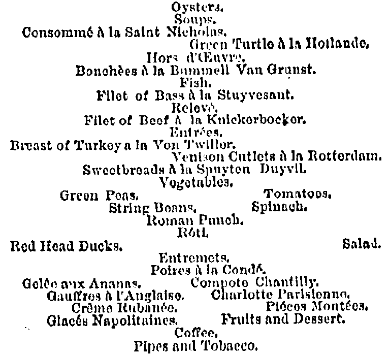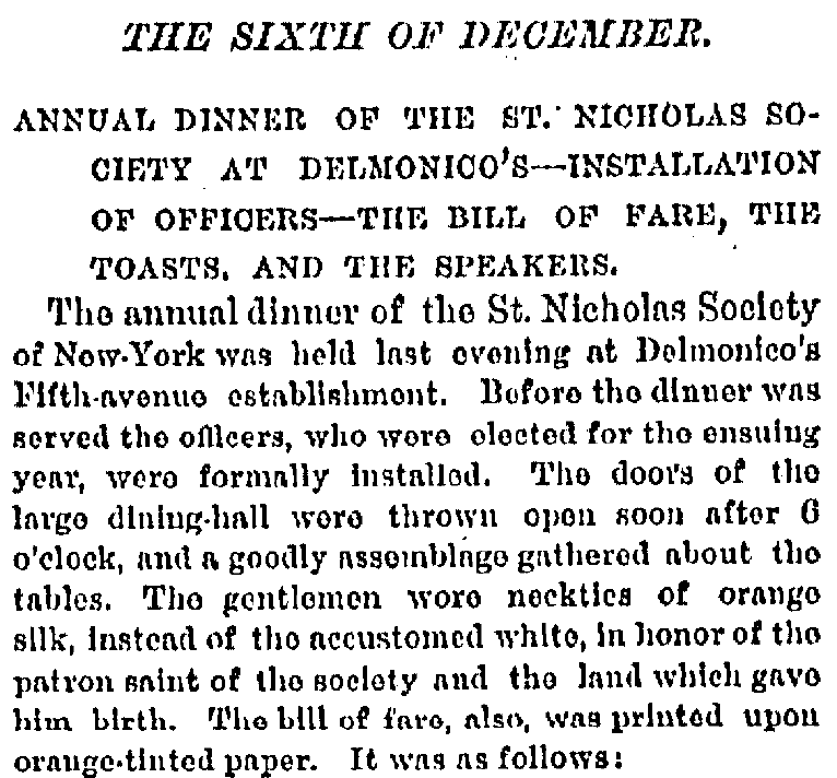 This little snippet from The New York Times relays the St Nicholas Society’s feasting in 1877:
