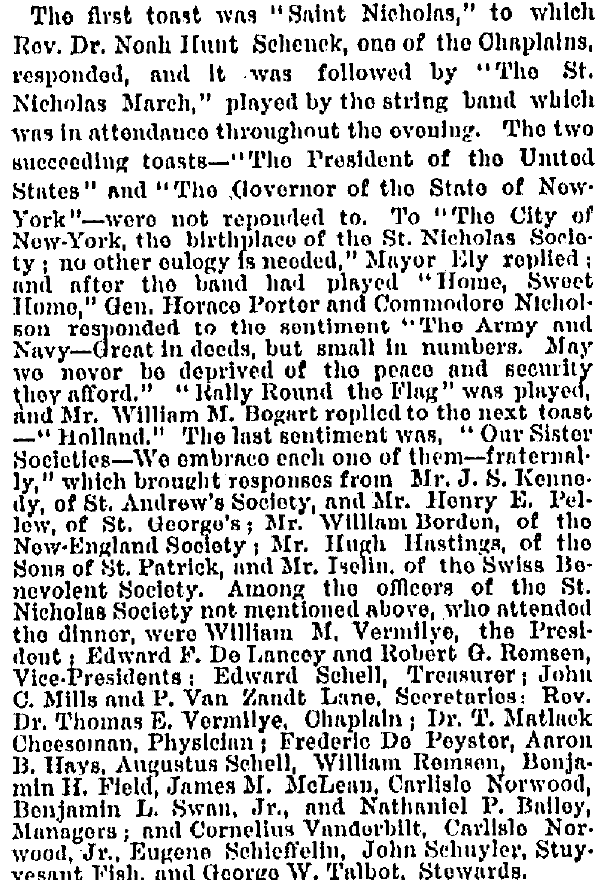 The newspaper further relates that: “At the request of the St. Nicholas Society, Mayor Hewitt had flags displayed on the City Hall yesterday in honor of the festival of St. Nicholas, the patron of this city.”