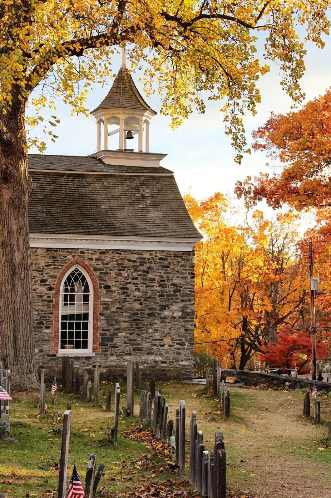 The sequestered situation of this church seems always to have made it a favorite haunt of troubled spirits. It stands on a knoll surrounded by locust trees and lofty elms, from among which its decent whitewashed walls shine modestly forth, like Christian purity beaming through the shades of retirement. A gentle slope descends from it to a silver sheet of water bordered by high trees, between which peeps may be caught at the blue hills of the Hudson. To look upon its grass-grown yard, where the sunbeams seem to sleep so quietly, one would think that there at least the dead might rest in peace.