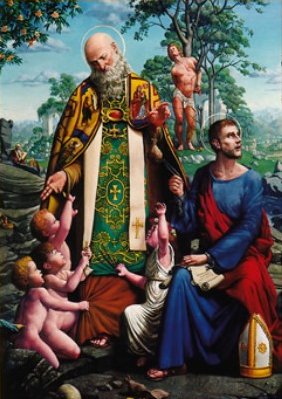 St. Nicholas was once fairly represented in the great metropolis which he watches over. Above he is seen in the sanctuary mural behind the altar at the Church of Saint Agnes – the best parish in all Manhattan. The mural was actually painted by Sean Delonas, a cartoonist for the New York Post. One of the cherubs pulling at St Nicholas is the son of the muralist.
