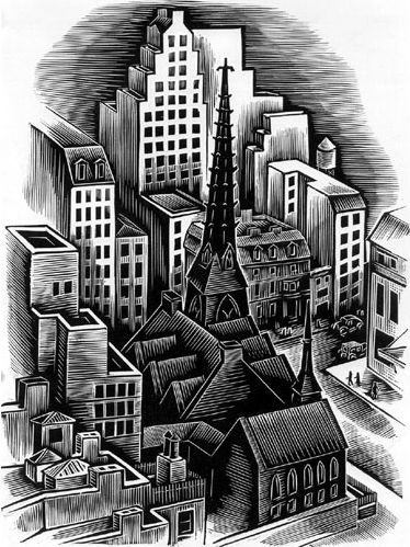 Behold, the church that was once called New York’s ‘Protestant Cathedral’. It’s hard to believe it’s gone, though I was born after it was demolished to make way for the Sinclair Oil Building. The Collegiate Church of St Nicholas was the oldest congregation in the City, founded in 1628 and housed in this late-nineteenth century building on Fifth Avenue. This photograph by Abbott shows Rockefeller Center rising in the background.