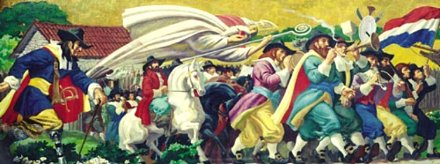 A very happy and blessed St. Nicholas Day to you all. St Nicholas is, as you all know, the patron saint of New York owing to our Netherlandish forefathers. Above you can see Lumen Martin Winter’s mural of St. Nicholas leading Peter Stuyvesant’s legion on their way to attack and take the Swedish fort of Christiania in New Sweden. The account of the battle by Washington Irving is hilarious and counts among my favorite selections of comic writing.