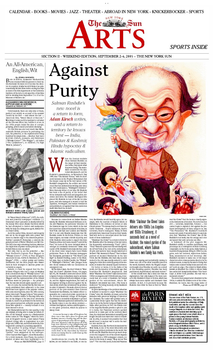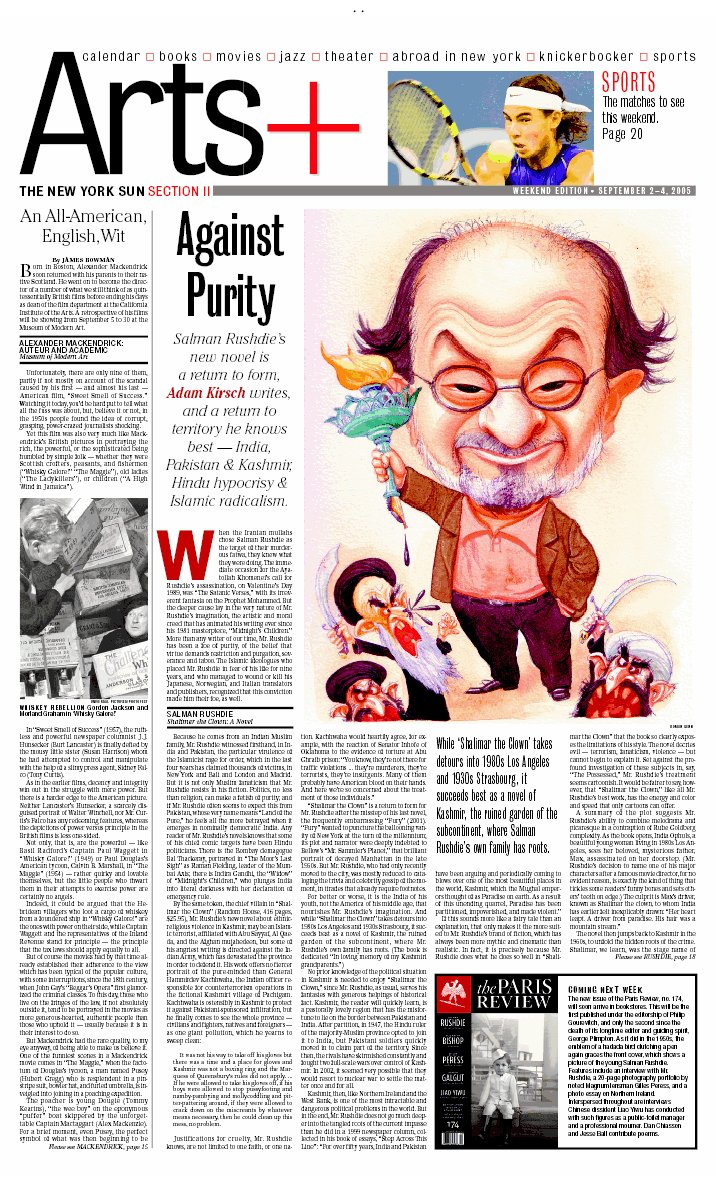 My ownly major aesthetic gripe against the Sun is the layout of the front page of their Friday second section, currently titled ‘Arts+’. (The ‘plus’ presumably refers to the inclusion of the Sports pages towards the end). Below at left is Section II as it appeared in the September 2-4 edition. The sans-serif font is just a tad too Gannett for a publication as esteemed as the Sun. To the right and below it I have placed two proposals for a reform of the Section II front page, both of which, I believe, are much more in keeping with the general aesthetic and demeanor of the rest of the New York Sun.