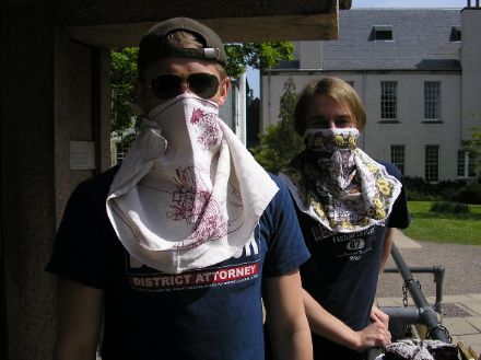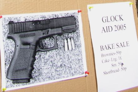Today a few volunteers outside the library succesfully raised a fair amount of money for Glock Aid 2005. “What’s Glock Aid 2005?” you ask. Essentially, Chris C. (Alabama’s unwanted son) wants to buy a handgun (a Glock, to be precise) and to raise money for this endeavour he spent all morning cooking and then from midday until 4:00pm selling his baked goods outside the Main Library.