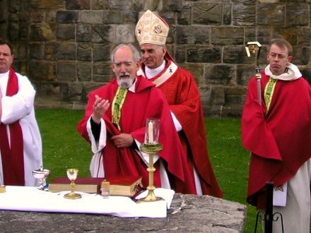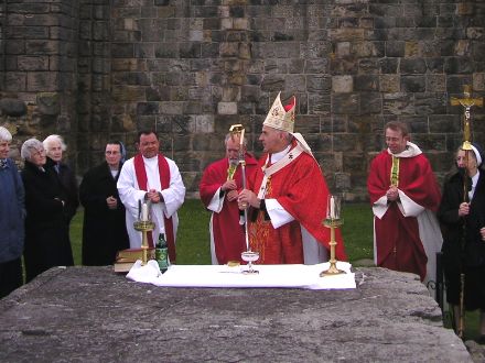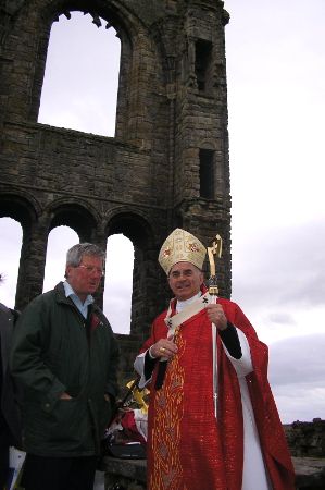 His Eminence, Keith Patrick O’Brien, the Cardinal Archbishop of St Andrews & Edinburgh visited St Andrews today, and offered the holy sacrifice of the Mass in the ruins of the Cathedral. It was the first time the Cardinal was in St Andrews since receiving his honorary degree last June. Above are Canon Halloran, our parish priest and Catholic chaplain to the University, and His Eminence.