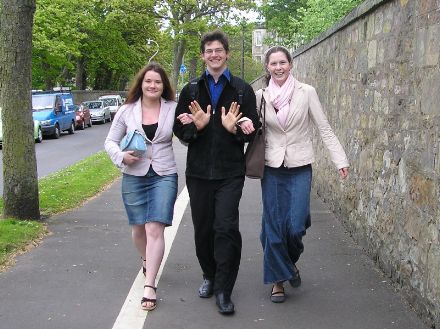 Roxanne, Stefano, and Clare saunter down the Scores to the Parish Hall. (Stefano is president of the Catholic Society).