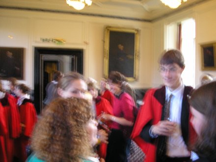 After luncheon in hall (breast of chicken dressed in huntsman sauce with roast potatoes and a rather rich slice of chocolate cake for pudding), I hung up the old gown and trencher (see above) and headed over to the Students Union for the Societies Fair. Good place to run into people really. Abby, Jaimie, Liam, and Stefano faitfully manning the Catholic Society table, D. and Stuart signing newbies up for the Conservative and Unionist Association, and a good many other folks. I joshed around with Freddy St. Johnston upstairs for a bit while he handed out fliers for MUN, likewise that favored son of Kenya Harry Brainch, who’s on the committee of the Overseas Society this year (headed up by America’s own Whit ‘Spirit of Lawrenceville‘ Miller).