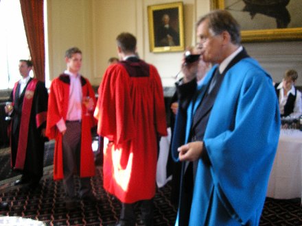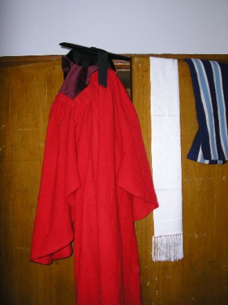 One of the attributes of one’s magistrand year (that’s fourth year to you outsiders) is that the red undergraduate gown is traditionally worn hanging off the shoulders. Bejants (first years) wear it properly, semis (second years) wear it back a bit, tertians (third years) wear it off one shoulder (off the right for arts, off the left for sciences), and for we lucky magistrands it barely touches the shoulders, hanging in a sort of slapdash way. I rather enjoy it though it’s a bit of a hassle trying to keep it off the ground.