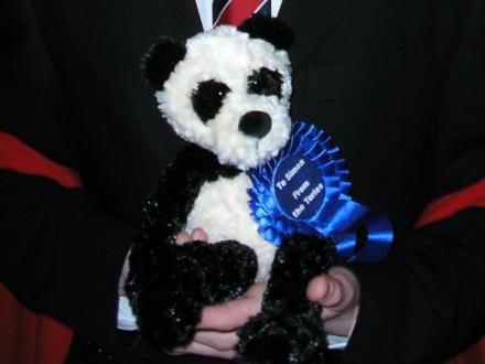 The Tories’ gift was a panda symbolizing Simon Pepper’s leadership of the World Wildlife Fund Scotland, bedecked with a Conservative blue rosette.