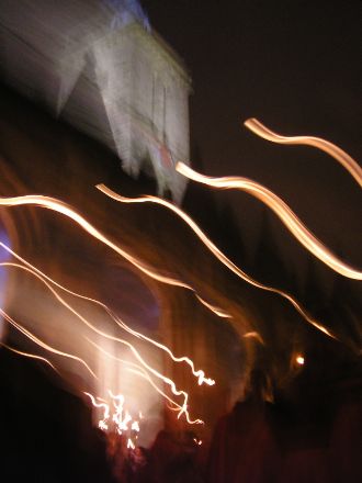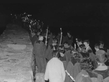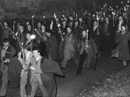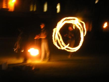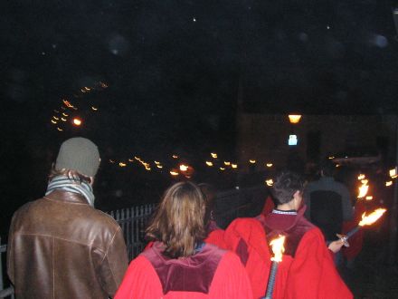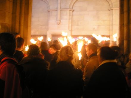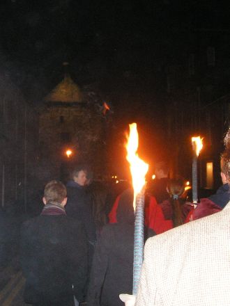 With nightfall came the traditional torchlit procession. Everyone gathered in the cloister of St. Salvator’s Quad where torches were distributed and some rather keen fire-people did very strange things with fiery objects, as can be seen in the above photograph.