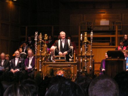 …and the new Lord Rector is then invested with his gown of office and accompanying cap of office. More laudatory addresses are then given, two songs are sung, the President of the Students’ Representative Council then gives the Loyal Address, which is finally followed by the rector’s own Rectorial Address. J.M. Barrie famously gave his rectorial address on ‘Courage’, and decades later John Cleese parodied it in his rectorial address on ‘Cowardice’. Sir Clement Freud began his in Latin, to the confusion of many and the amusement of three or four chuckling academics on the stage. He had said in Latin “This speech isn’t going to be very interesting, so please feel free to switch on your mobile telephones”. Simon Pepper lauded the maturity of the student body, warned that we must be constantly on guard in case Parliament strips the University of its unique privileges and method of government, while spending most of the address talking about sustainability.