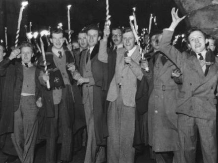The procession then walked down to the end of the pier, where we sang the Gaudeamus. A proper Pier Walk, in the St Andrews tradition, involes walking down to the end of the pier, then mounting the higher wall and walking back along the thin surface of the wall, all while being assailed by the vicious wind and waves of the North Sea. At this point I was with J.E.B., PMC of the A Sqn Mess, Randolph Macgregor, R.J.E. Bradley, and a few others, and there was some Scandinavian busybody atop the pier instructing us that we would not be allowed to carry our torches while climbing the ladder to the top of the pier wall. Mind you this was a student, not a policeman or town or university official. “I don’t want to see anyone carrying torches up the ladder!” he proclaimed with pomposity. “Too bad, Johnny Foreigner!” replied the irate enthusaists of torchlit pier walks proclaimed, “Go back to Russia!”. Just as it was felt the busybody was sufficiently put in his place, an even mightier wind (for it was already exceedingly windy) came upon us and we conceded that we would extinguish our torches. As this concession was executed, the busybody then further shouted “I’m sorry, the winds are too strong. In the interests of health and safety I cannot let any more people climb up.” Cheeky bastard! Of course by this time we had resolved to give him no further care, as he clearly must not be aware that here in the English-speaking world we don’t care for self-appointed busybodies telling us what to do. Personal autonomy, though constantly assailed and attacked in these wicked days, remains the pride and joy of the Anglo-Saxon. Thus we mounted the ladder with pride and reverance for the traditions of our ancient university and an utter disdain for the authoritarian mentality of the interloper. The wind was frightful, my friends! We feared our academic gowns might act as sails to catch the wind and throw us unto the craggy rocks below. But damn the wind and damn the rocks and damn that wretched interloper, we were dashed if we weren’t going to do a proper pier walk! And a proper pier walk we did!