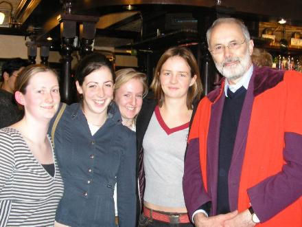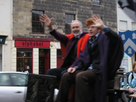 How one enjoys the traditional and ceremonial side of university life! Having duly elected Simon Pepper OBE as the new Lord Rector of the Universitas Sancti Andreae, the usual rigamarole of festivities and rites recently took place. The first is the Rectorial Drag, in which the Blues of the University drag the new Lord Rector around the town in a carriage. Along the way he makes various stops, mostly at public houses, in which a number of student groups and the like present him with gifts and drinks. We in the Boat Club arranged to meet the Lord Rector at the Central bar in Market Street. Above (and below), having alighted from his carriage, the Lord Rector greets a number of students, among them Felix Lobkowicz, the recently-elected President of the Boat Club, and Chris Kololian, the outgoing president.