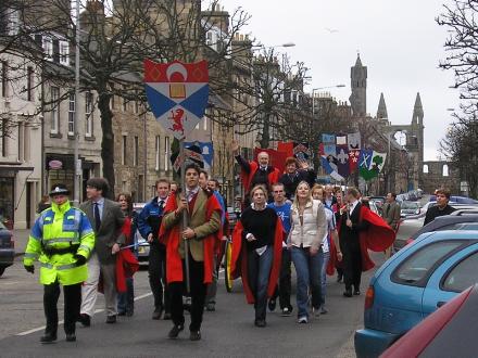 In front of Parliament Hall, Miss Laura Wilson, Convenor of the University of St Andrews Union Debating Society (the oldest “and some would say the finest” debating society in the realm), presented the Lord Rector with a scroll…