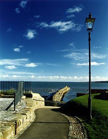 From the quad we made our way through the ancient gate of the college, founded in 1450 by Bishop James Kennedy, and down North Street, past the ruins of the Bishop’s Castle, the crumbling remnants of the great Cathedral, Scotland’s mother church, to the medieval pier. In the photo immediately above, the lights of the torchs line the pier. Click here to see a daylight view.