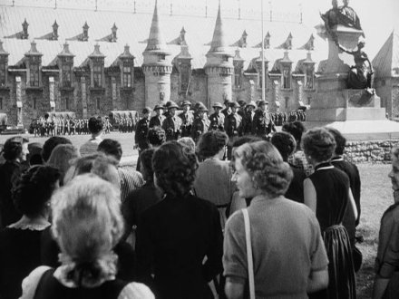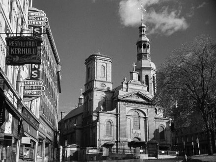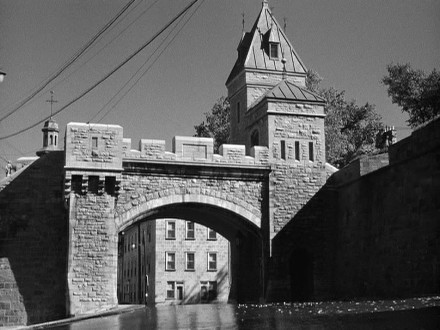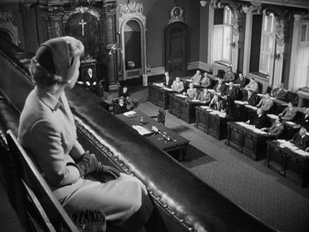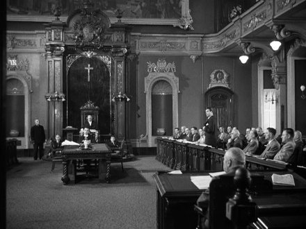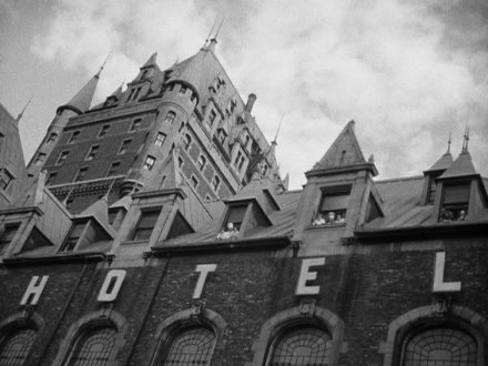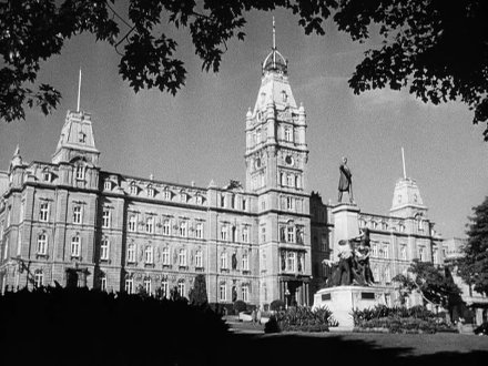 A splendid display of this Québec can be found in Alfred Hitchcock’s 1953 drama I Confess. The film had been recommended to me often and I finally got around to seeing it tonight. I won’t give away any of the plot, which is a good one, but Hitchcock lives up to his reputation with his excellent framing of the scenes. (Though I must admit, half of it is merely the settings in the Ville de Québec themselves). They include a peek into the Québécois Parliament. Above the Speaker’s dais is displayed not only the Sovereign’s arms, but also a crucifix, exhibiting our loyalties both temporal and spiritual. In the court room you find yet another blend of the Anglo and the French. As you no doubt recall from our handy little map, Quebec is a country with a mixed legal system. Founded as Nouvelle-France it had the civil system derived from the Romans. Captured by the British and later transformed into part of the Canadian Confederation, it has accrued layers of the Common Law so dear to we Anglos. The officials of the court wear British-style robes — the judge even has a tricorn hat — but over the jury looms a large crucifix. English government and French culture tempered by Catholic truth; not a bad mixture.