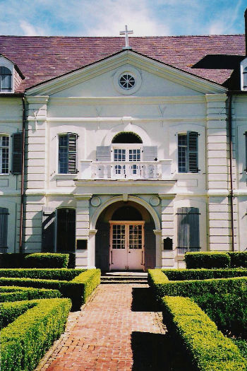 BUILT IN 1745, the Old Archbishop’s Palace in New Orleans is believed to be the oldest building in the entire Mississippi Valley. The building has gone through a number of ecclesiastical uses through the centuries, originally constructed to French plans for the Ursuline sisters who came to foster the Christian faith in la Louisiane. On the corner of Chartres Street and Ursulines Avenue in western corner of the Vieux Carré, the Convent survived the Great Fire of 1788, along with the neighboring barracks and Royal Hospital. The Ursuline nuns took orphans into their care here, and educated the daughters of the city’s elite and of the local plantation owners (among them Baroness Pontalba), as well as organizing special handiworks classes for Indian and Negro girls. And it was in the Chapel of the Convent that the Ursuline nuns kept vigil during the Battle of New Orleans in 1815, praying ceaselessly for the salvation of New Orleans from destruction. This great event was attributed to the Blessed Virgin, and Notre Dame de Bon Secours (Our Lady of Prompt Succour) was adopted as the patron of the city and diocese of New Orleans and the state of Louisiana.