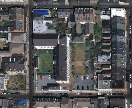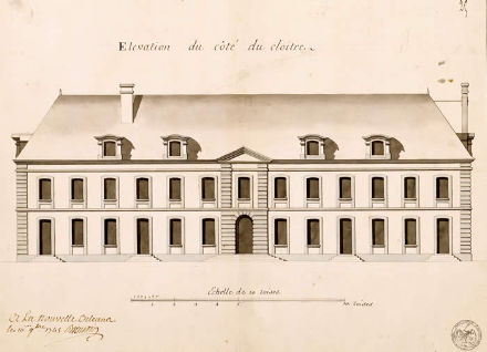 The old palace and the Church of St. Mary come together to form an ‘L’. The conciergerie can be seen at the left on the streetfront, and the servants quarters at the bottom left. After the barracks and Royal Hospital had been torn down, the Ursulines built a line of row houses, which can be seen at the right of the aerial view, and below in a photo from the 1930s.