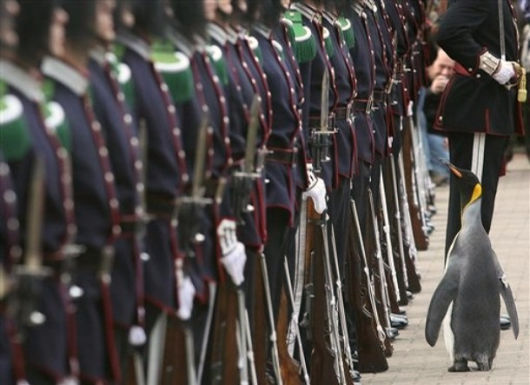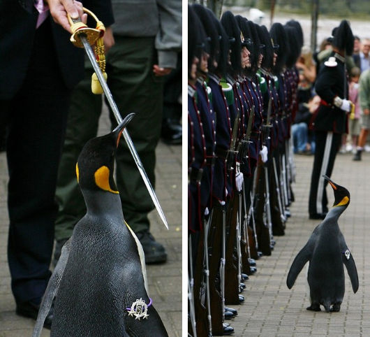 The King of Norway’s Guards is the household regiment of that Scandinavian sovereign, but their honorary colonel resides in Edinburgh, where the regimental band often performs in the famous Military Tattoo held each summer. This year, the Colonel was honored with no less than a knighthood and took the opportunity of the unit’s presence in Edinburgh to inspect the regiment. Ordinarily, this would be an unremarkable event were it not for the fact that the Colonel is Nils Olav, a penguin currently in residence at the Edinburgh Zoo.