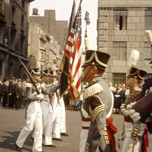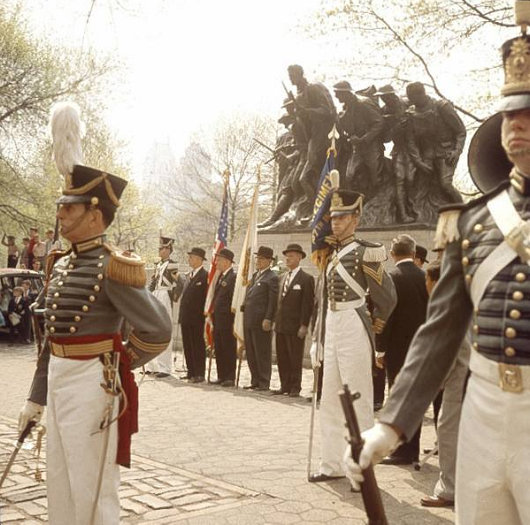 These photos are from a May 1956 ceremony marking the foundation of the Seventh Regiment. While, scandalously, the Seventh has since been disbanded (and the beautiful armory its members built with their own resources illegally seized & demilitarized by the State), the dead of the venerable regiment are still remembered each year on the weekend closest to Veteran’s Day.