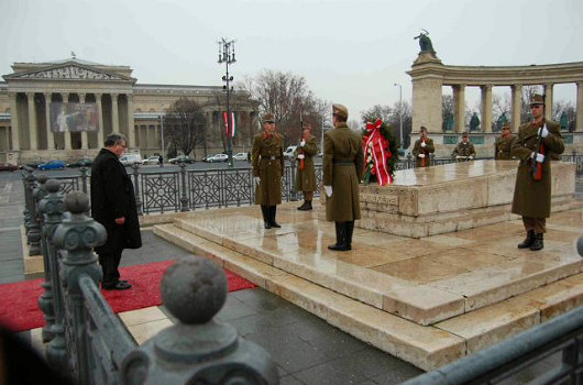 After the President offered the Grand Master a luncheon in his honour, Fra’ Matthew laid a wreath on the Memorial to the Fallen Soldiers in Heroes’ Square, in the center of Budapest.