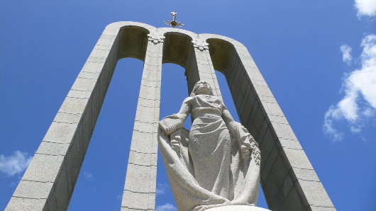 Three tall arches represent the Holy Trinity, above which rises the “sun of righteousness”, topped by the Holy Cross. The central female figure at the base — the replacement for the Virgin Mary that seems to eventually pop up in every Protestant sect who rejects Marian devotion — was sculpted by Coert Steynberg, who designed the Krugerrand, perhaps the most prominent gold currency in the world.