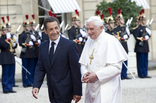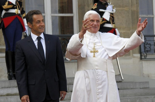Et ainsi, en route pour célébrer le 150ème anniversaire du grand sanctuaire de Lourdes, le Saint-Père est venu à Paris, pour rappeler à la France ses racines, son histoire, et son héritage chrétien. Etrangement, Benoît XVI a trouvé un ami dans le président de la République, Nicolas Sarkozy. « Sarko » est la réponse de la France à une question que personne ne pose – à quoi ressemblerait un homme qui serait à la fois Bill Clinton et George Bush ? – mais cet homme, non-religieux, ayant des origines juives (ndt: en fait Sarkozy est catholique), s’est montré enthousiaste à l’idée de remplacer une « laïcité négative qui rejette » avec (ce sont ses mots) « une laïcité positive qui discute, respecte et inclut ». Au lieu d’une situation dans laquelle la République limite l’église, Sarkozy plaide pour une République où l’église (et la mosquée, et la synagogue, et la loge maçonnique…) peuvent paisiblement coexister et même agir les une sur les autres.