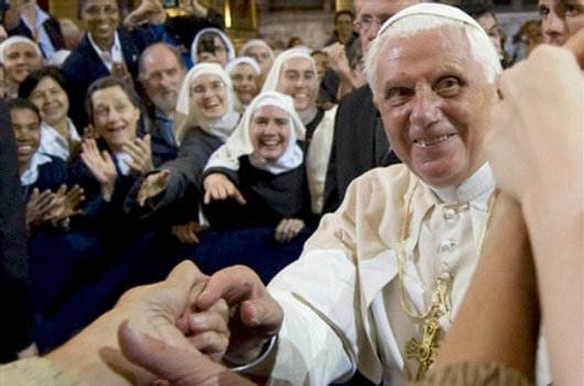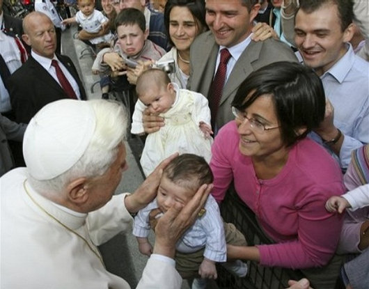 Quittant le Collège, Benoît a pris un moment pour prendre dans ses bras et bénir quelques bébés, dans la foule massée le long des rues.