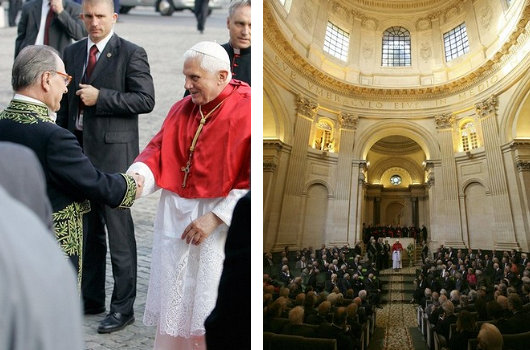 Samedi a commencé par une visite à l’une des les plus augustes institutions françaises, l’Institut De France, une société savante composée de cinq académies (la plus célèbre étant l’Académie Française, dont les membres sont connus sous le nom ‘les Immortels’ – en français dans le texte). Le chancelier de l’Institut De France a souhaité la bienvenue au pape, qui a parlé aux académiciens rassemblés dans le grand hall de l’institut. Alors que l’Institut lui-même fut fondé par des franc-maçons de la loge des Neuf Soeurs, la plupart des académies qui en font actuellement partie ont leurs origines durant la monarchie catholique de la France.