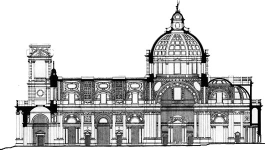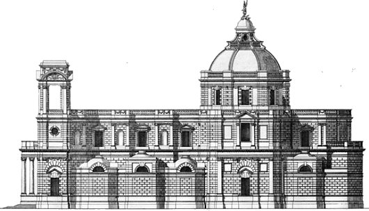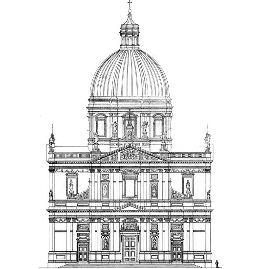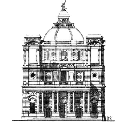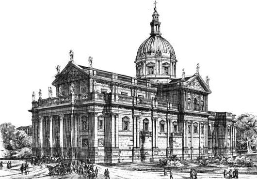 John Kelly’s proposal bears relation to the Vicars & O’Neill design, but the façade is much better, much more Roman. Those trumpets seem a bit gaudy, however.