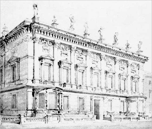 Originally Cockerell had declined the opportunity to submit a design, with such lofty names as Pugin, Wyatt, Barry, and Decimus Burton also declining the offer. A few years later, Cockerell nonetheless worked on this design for the Tory gentlemen’s club, which is superior to that conceived by another architect which was eventually built. Cockerell devised a “lofty Corinthian colonnade of seven bays” according to the Survey of London. “The columns have plain shafts, their capitals are linked by a background frieze of rich festoons, and the Baroque bracketed entablature is surmounted by an open balustrade with solid dies supporting urns and gesticulating statues.”