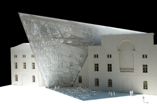 Libeskind’s addition to the museum takes the form of a jarring triangle, pointing in the direction from which the British and American bombers came to attack the city. “It is something like a lantern, a signal, a beacon that evokes the city itself,” Libeskind told the press. “It creates a question mark about the continuity of history and what it means. It gives people a point of reflection.”