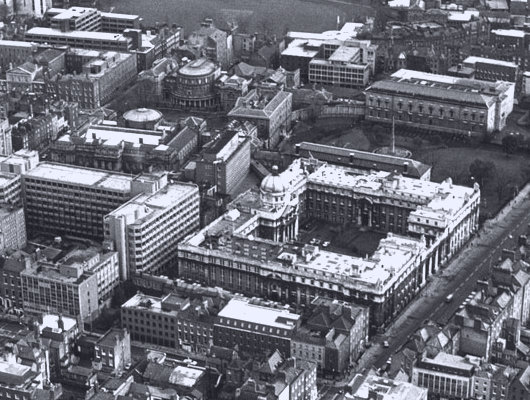 After the Irish Free State was created, the Dáil Éireann chose to meet in the Royal Dublin Society’s lecture hall, part of the Leinster House complex adjacent to the Royal College of Science. While various proposals were made on where to site permanently Ireland’s new parliament, the TDs & Senators got comfortable at Leinster House and the government purchased the building from the RDS. Encumbered as Leinster House is by the National Library and the National Museum on either side, the government expanded into the Royal College of Science building. The RCS was subsumed into University College Dublin in 1926 but the engineering faculties remained on Merrion Street in what was know increasingly known as ‘Government Buildings, Dublin’.