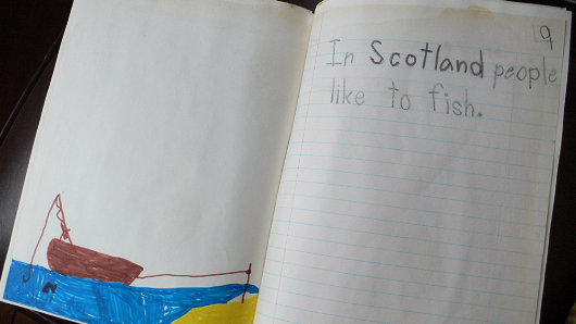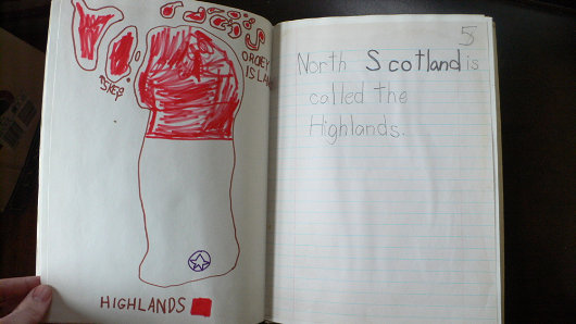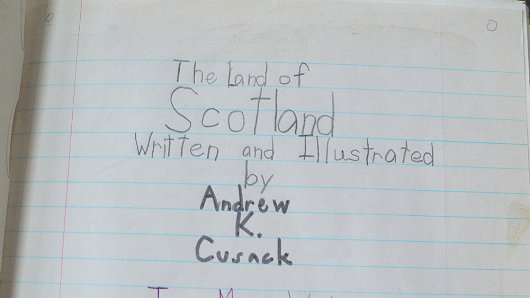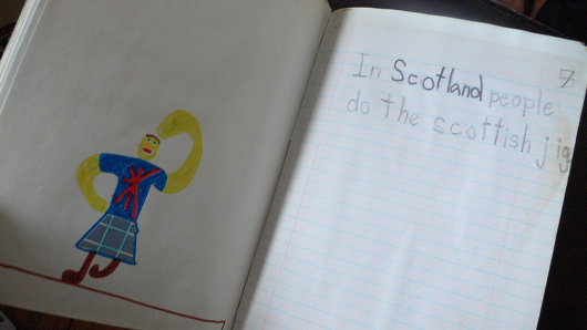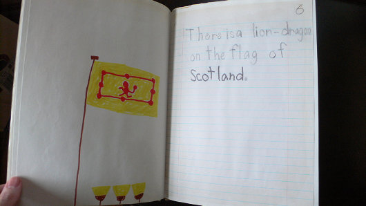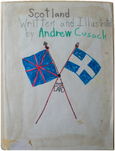 Were I to review this book, I would say it is riddled with inaccuracies and depicts a stereotypical Hollywood version of Scotland far-removed from reality. But then, it was written in 1991 by a seven-year-old (yours truly), which is already eighteen years ago now. The ultimate schoolboy error is that I was apparently incapable at age 7 of producing a vexillologically accurate reproduction of the Saltire. My incorrect version of the Scottish appears like the old Greek flag, a white cross extended across a blue field. (See the correct flag here).