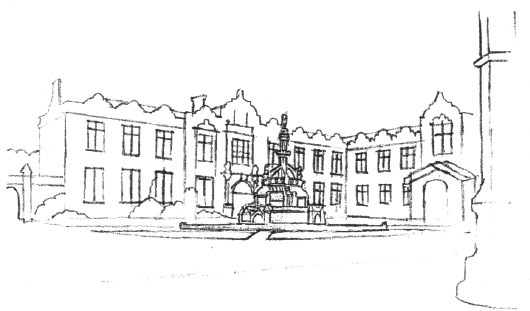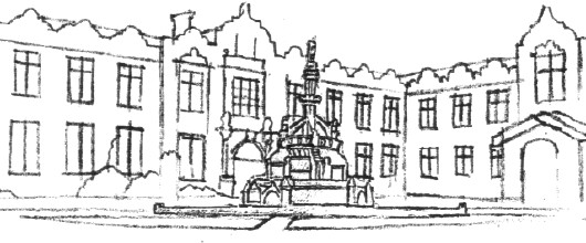 One architectural ‘improvement’ would be the erection of a tower at the junction of the two blocks but this is fraught with all sorts of difficulties. Another innovation, which I believe would be much preferable, would be the creation of a tall fountain in the middle of the lawn. This could be approached by diagonal pathways leading from the four corners of the quad. These could be cobble edged (as indeed should be the existing driveway). Such pathways would very aptly introduce the saltire into the ground plan and add visual interest by increasing the movement to and fro within the quad. More importantly, a fountain would provide a point of considerable architectural and symbolic importance in the heart of the university. The flow of water would also bring animation to an otherwise featureless expanse and serve as a designed counterpart to the natural movement of the sea beyond.