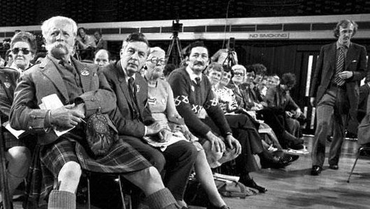 The emblem was commissioned by William Wolfe (right) in 1962 for the parliamentary by-election in which he was standing as the Scottish Nationalist candidate. The party had typically employed a lion rampant as its symbol, which Wolfe thought too complex, and got Julian Gibb (in his own words, “scarcely out of childhood”) to design the brilliantly simple logo. “A political visionary with an eye for iconography,” according to Gibb, Wolfe used the emblem in the unsuccessful by-election campaign and a year later successfully proposed it to the party for adoption as the party emblem.