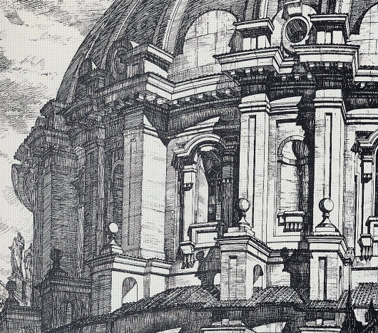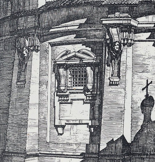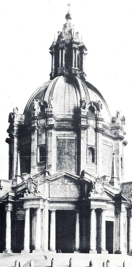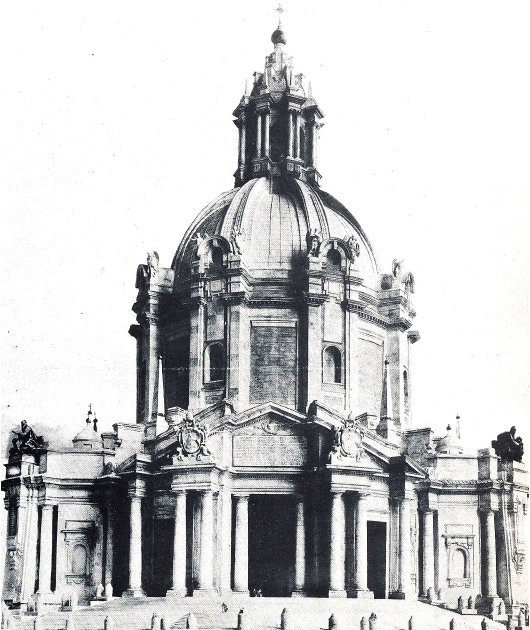 What you see is a harmonius and dissonant architectural symphony of complexly layered elements — formal and symbolic, masterfully defined by shade and shadow, combining rhetoric and substance, Baroque fanfare in Palladian drag, and whose juxtapositions — or rather, collisions — of curves, rectangles, diagonals — as squat columns, gross piers, useless buttresses, eloquent walls and voids, domeless drum, protruding and receding segmented pediment — must in the end compose in the Fascist era a glorious final gesture of what can be considered Baroque survival.