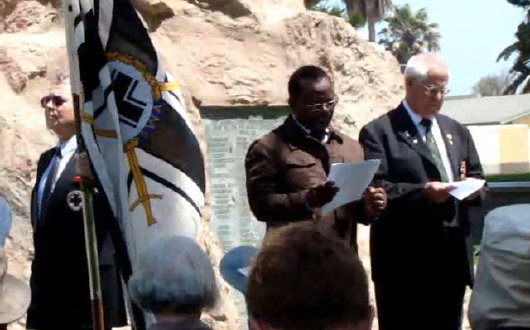 A similar ceremony takes place every year at the German Navy Memorial in sunny Swakopmund on the Atlantic coast. The Governor of Erongo (above) attends and thanks the Traditionsverband for organising this commemoration in which the living show their respect for the dead. Tribe addressing tribe as friends, neighbours, fellow countrymen — as real people, not as make-believe “citizens of the world”.