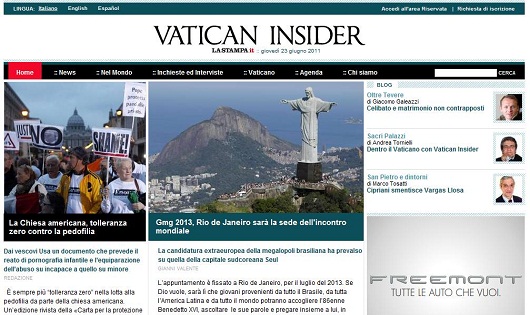 Anyone remotely interested in the important affairs of the church and the world should make themselves aware of the new ecclesial news site, Vatican Insider. The site offers English translations of the significant journalistic output of the Italian newspaper La Stampa and includes commentary from Andrea Tornielli, John Allen, and others. V.I. already has an interview with Mons Georg Ratzinger and a look at church-state relations in mainland China, amongst other things. Definitely one to add to your daily perusing.