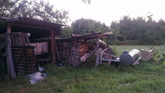 Nobody was going any further tonight — that was plain to see — so, rather than attempt to reach the Ruhr after dark, I wandered along a tiny lane, past a farm and into a grove of old agricultural machinery, the rusty tractors and wood-chippers still just discernible among the trees in the twilight. There I found a tiny shack containing fire wood, where I dropped my larger suitcase before heading back to the service station to find supper.