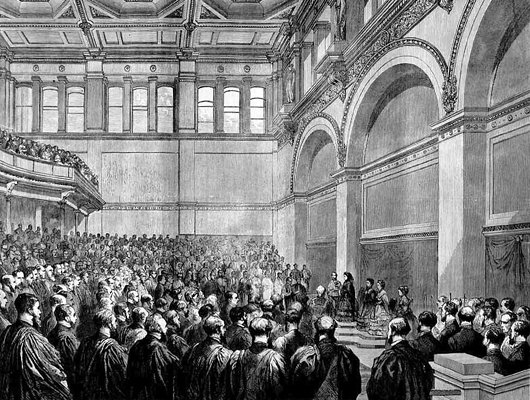 Since its founding, the University had been dependent upon the government’s purse for funding, as well as for housing. Accomodation was provided in Somerset House, then Marlborough House, before evacuating to temporary quarters in Burlington House and elsewhere. It was not until the 1860s that Parliament approved the appropriate grant for a purpose-built home for the University to be erected in the rear garden of Burlington House.