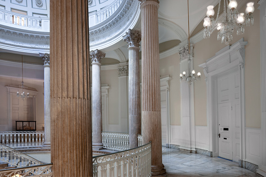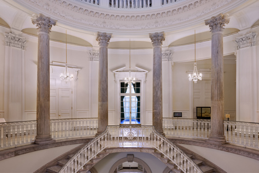 The sweeping staircase of the rotunda is impressive, but the bland palette would be much improved if the walls were painted in a pale Georgian blue.