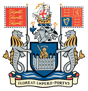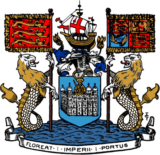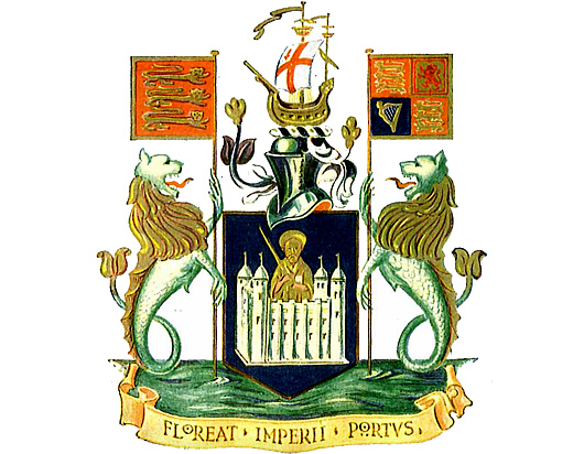 Sea lions act as supporters, also bearing standards of the royal arms of England and of the United Kingdom, while the motto proclaims in Latin May the Port of the Empire Flourish.