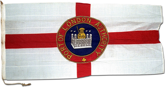 The Port of London Authority has its own flag (above) as well as its own ensign — a blue field with a Union Jack in the canton and in the fly a golden sea lion bearing a trident. Distinctive pennants also exist for the Chairman and Vice Chairman of the Authority. (These can be seen here.)