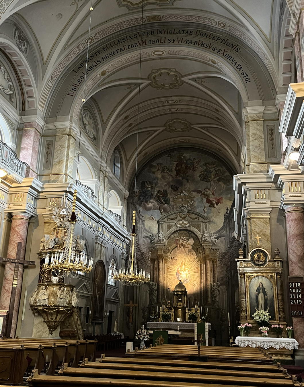 Arriving in the Church of the Holy Trinity in the great square for the Hungarian Mass on Sunday, the congregation at the Mass in German preceding it was still filtering away and clearly is the main event of the parish.