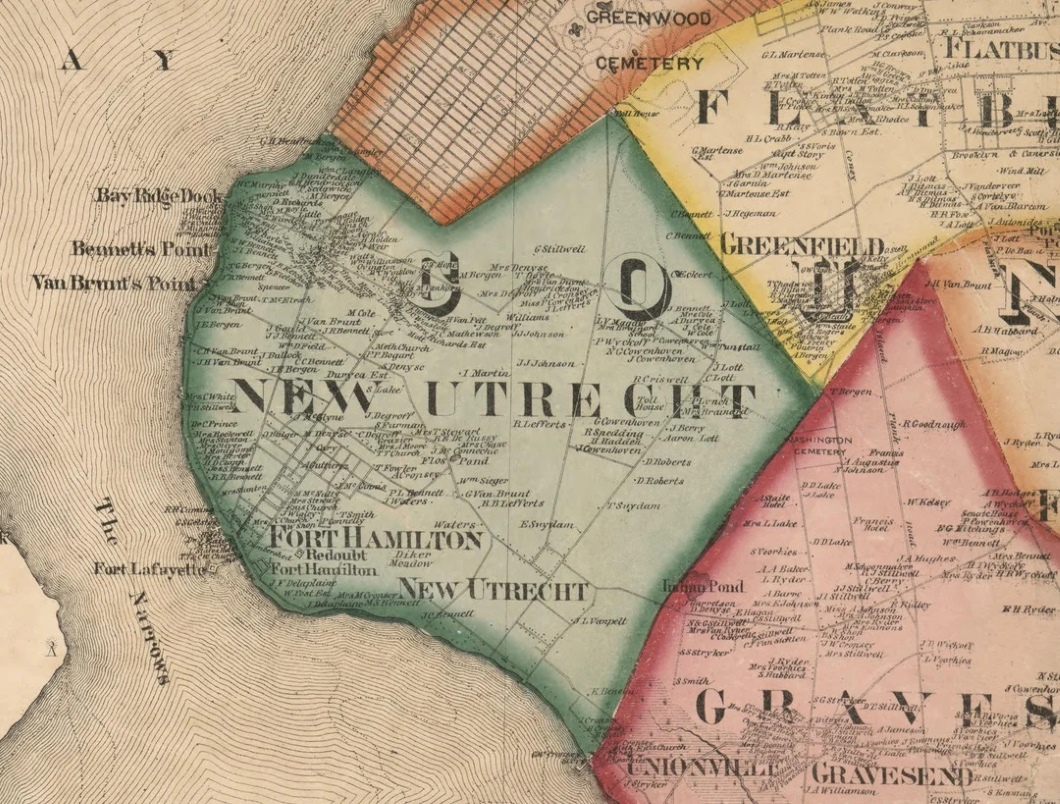 New Utrecht was first settled by the Dutch, as its name bears witness, about two hundred years ago. Until within some thirty years a few Holland families, to which were added one or two of Huguenot origin, owned nearly all the land for many miles around; and even now, when you find yourself here in a company of farmers, it is safe to address two men in three as Van Brunt, Bergen, Cortelyon, or Bennet.