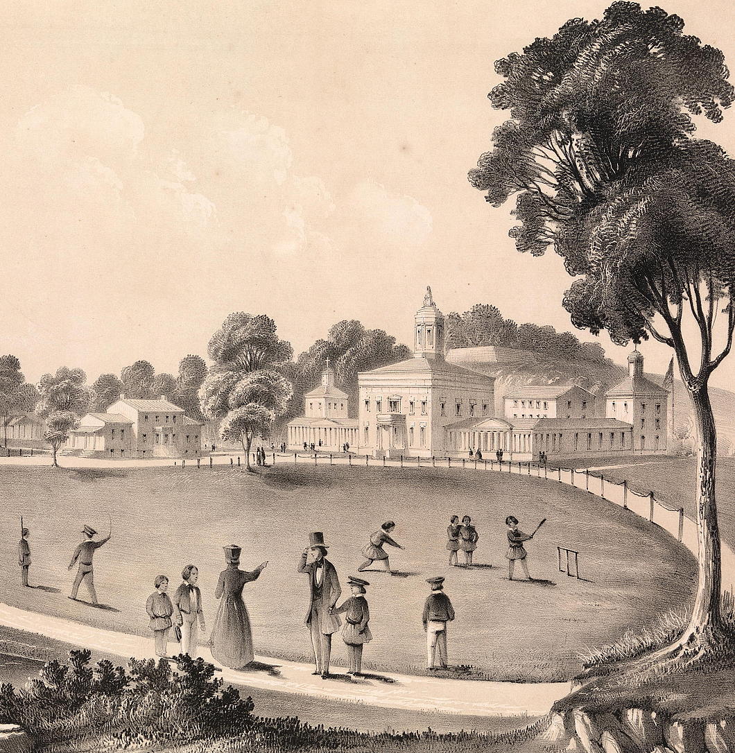 This charming rustic scene shows children playing cricket on the grounds of St John’s College, Fordham, with a priest speaking to a gentleman out on a constitutional with his son. As the college advertised itself in an early prospectus: